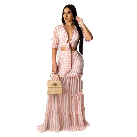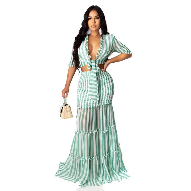 Casual Sheer Mesh Patchwork Two Piece Set Dress Autumn Striped Fungus Lace Up Crop Chiffon