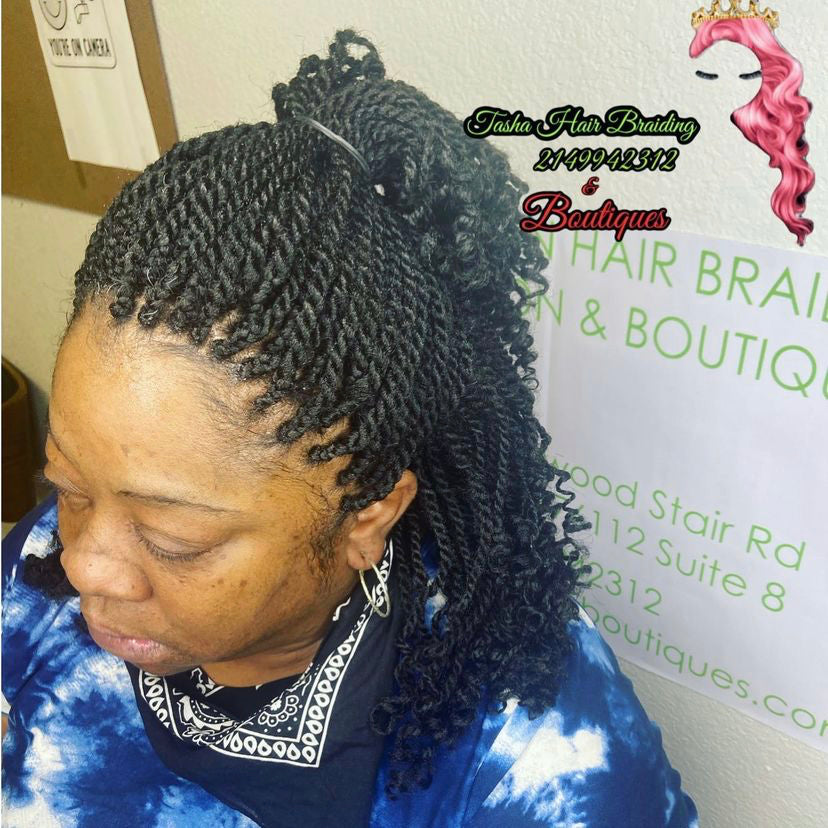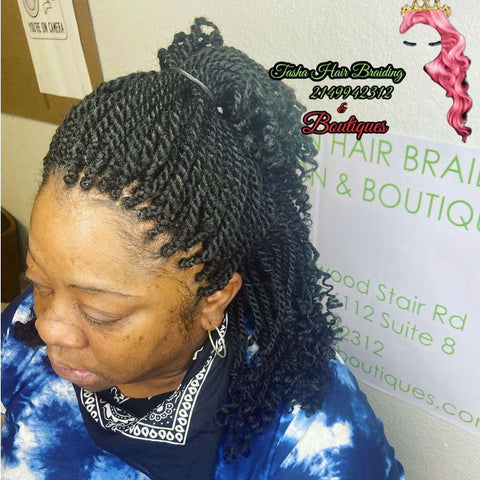 Kinky twist is a process of adding synthetic hair to the natural hair while twisting the hair to give it a more natural look. It is usually short, curly at the ends and bouncy.