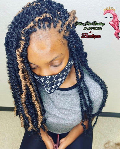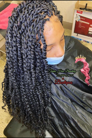 Passion twist requires the braider to add hair keeping loose at possible to create a bouncy look.