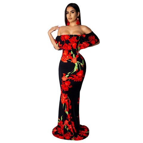 Floral Print Sexy Mermaid Long Dress Women Slash Neck Ruffles Sleeve Bandage each Dress Summer Off Shoulder Backless