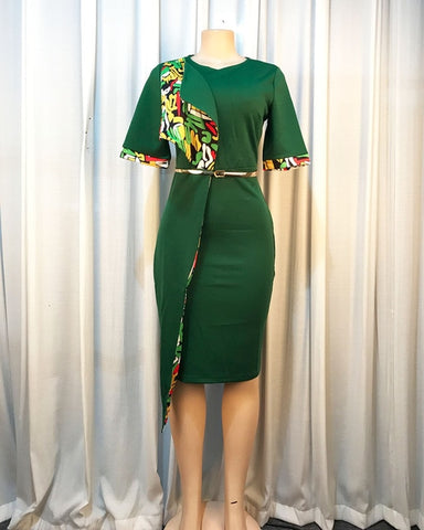 O-NECK BELTED WOMEN OFFICE DRESS GREEN CHURCH HALF SLEEVE SUMMER 2020 NEW
