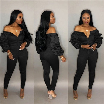 Autumn Women Casual Jumpsuit Zipper Slash Neck Off Shoulder Long Puff Sleeve Thick