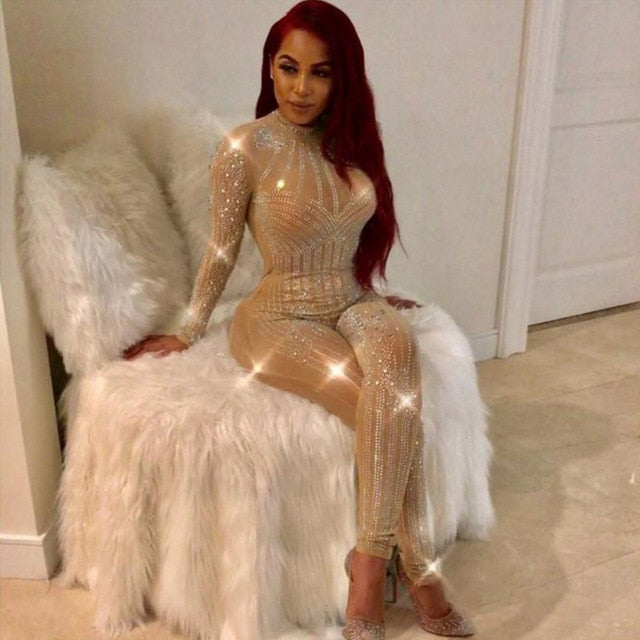 Women Mock Neck Jumpsuit Sequin Rhinestone Diamonds