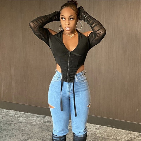 LONG STACKED SLEEVE HALTER ZIPPER PATCHWORK SEXY CROP TOP CORSET SHIRT WOMEN SOLID TOPS PARTY CLUBWEAR FEMALE HOT
