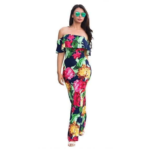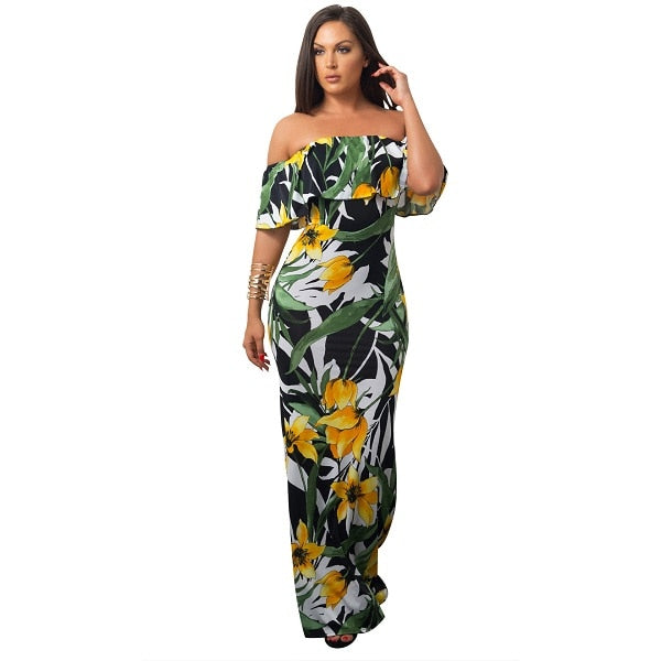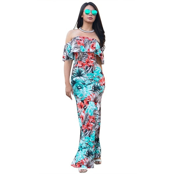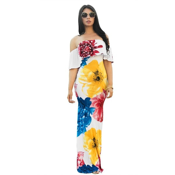 Summer Autumn Sexy Casual Dress Slim Off Shoulder Short Sleeve Dress Slash Multicolor Ruffles Long Dress Vestidos
